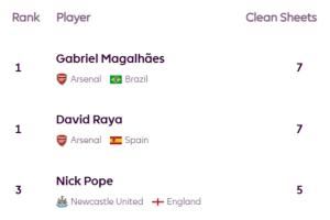 7次:加布里埃尔(阿森纳)、拉亚(阿森纳)